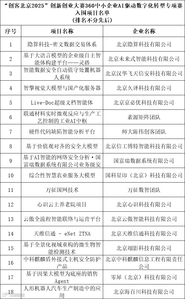 第十届“创客中国”北京市中小企业创新创业大赛暨“创客北京2025”创新创业大赛龙头企业专项赛包括海博思创·储能+AI专项赛、京东方·生命科技医药健康专项赛、京东·创客合伙人专项赛、360中小企业AI驱动数字化转型专项赛、北京人形机器人创新中心·具身智能专项赛、东华软件·金融科技创新专项赛、用友BIP·商业智能体创新应用大赛、西门子·Xcelerator联合解决方案专项赛、集创北方·半导体与新型显示专项赛、中国有研·新材料专项赛、软通动力·AI产业化应用专项赛、北汽·新汽车科技创新专项赛、中国商飞北研中心·民用航空专项赛十三家龙头企业专项赛道,龙头企业专项赛以行业龙头企业“张榜”,中小企业“揭榜”的形式,构建大中小企业协同创新、资源共享、融合发展的产业生态。
