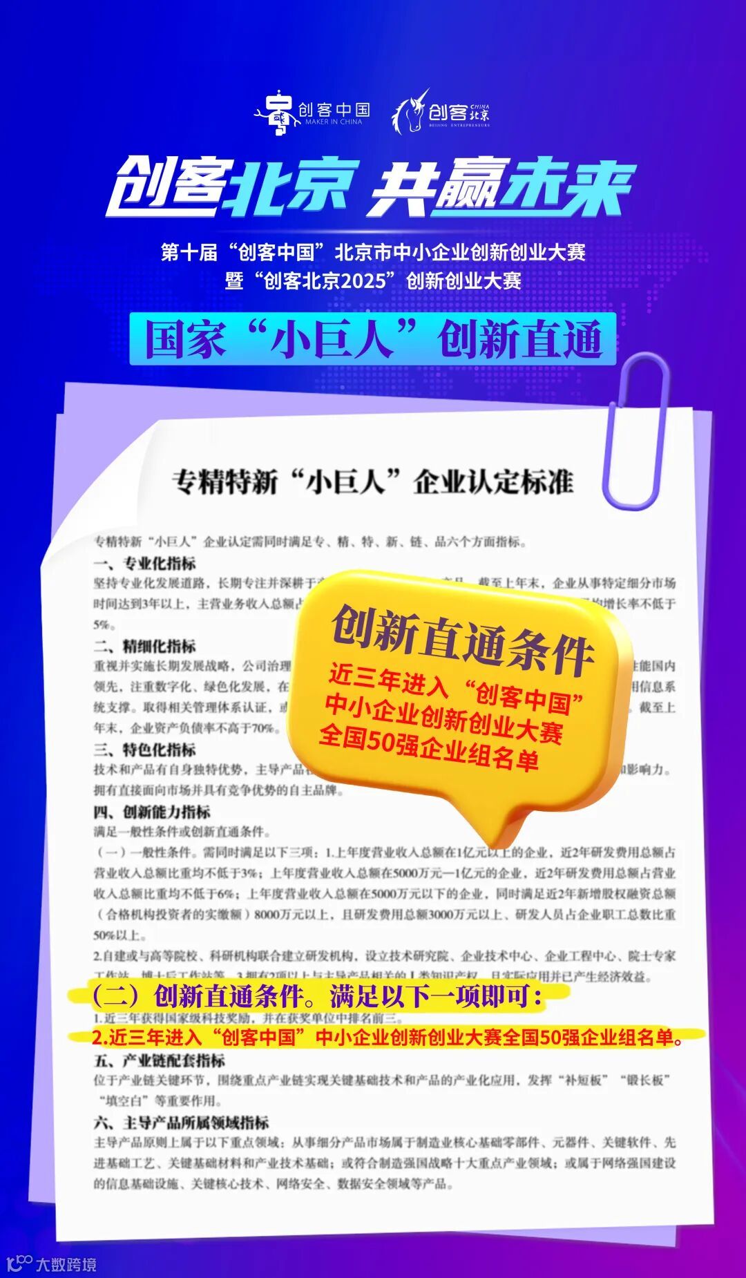 作为工信部指导下的重要赛事,“创客北京2025”优秀项目将被推荐参加全国总决赛评审。依据《专精特新“小巨人”企业认定标准》,近三年进入“创客中国”中小企业创新创业大赛全国50强企业组名单的参赛企业可获得创新能力指标分值,有机会成为国家级专精特新“小巨人”企业。值得一提的是,为提升优质企业参赛便利度,北京市“专精特新”中小企业报名参加区域赛可直通区级复赛。
