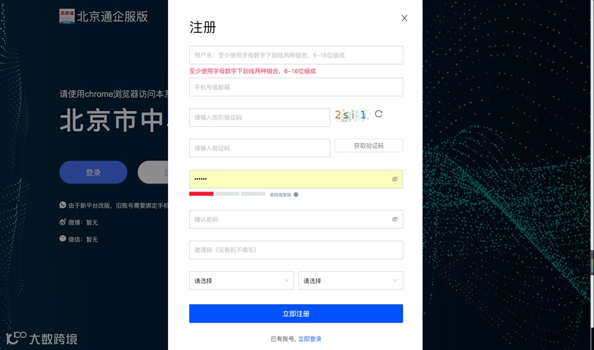 填写完相关信息后,点击【立即注册】,页面跳转到登录界面,请使用已有账号进行登录。