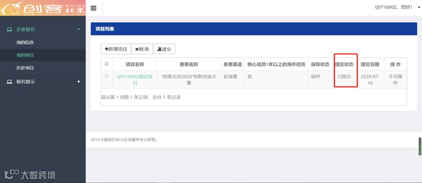 项目信息保存成功后,进入项目列表页勾选需要提交的项目,点击【提交】按钮,项目状态变为“已提交”即算报名成功本次大赛。
