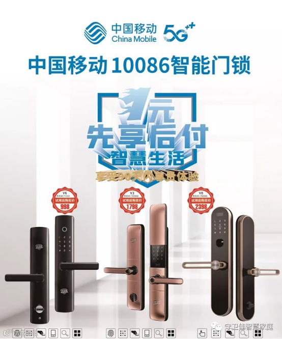 90天体验期满,客户满意,只需要支付尾款,针对线上京东价格,中国移动智能锁每款补贴1000-1600元,总额100000000元,补贴后只需支付998,1798,2398。
