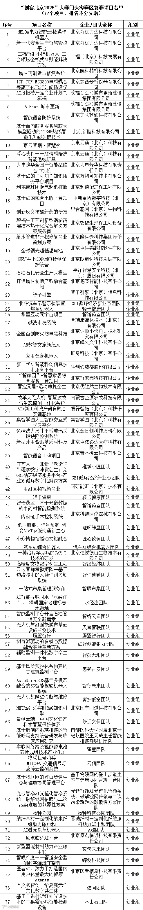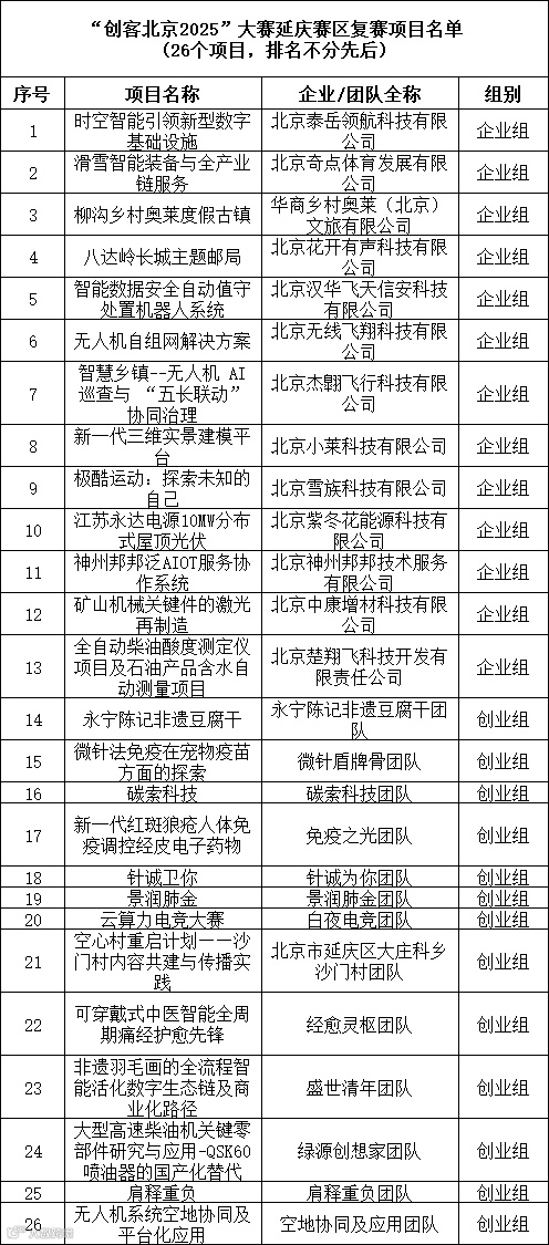 第十届“创客中国”北京市中小企业创新创业大赛暨“创客北京2025”创新创业大赛各赛区初赛已全部结束,现将北京区域赛入围复赛的第一批项目名单公布如下,后续比赛资讯请继续关注北京市中小企业公共服务平台网站、微信公众号和北京通企服版APP。