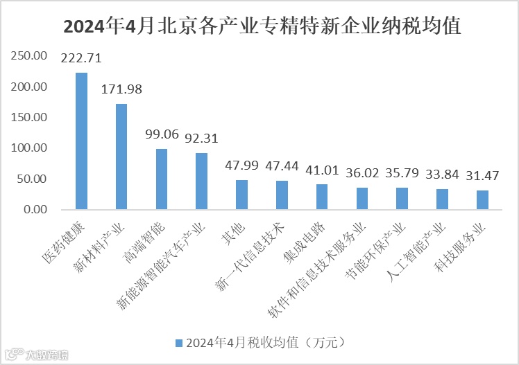 2024年4月北京专精特新企业实现净税收[1]36.69亿元,同比增长14.54%,税收均值为全市中小企业平均水平的3倍以上。从区域分布看,税收均值排名前三的依次为延庆区(105.52万元/家)、平谷区(90.69万元/家)和顺义区(78.23万元/家)。从高精尖产业分布看,税收均值前三位的产业依次为医药健康产业(222.71万元/家)、新材料产业(171.98万元/家)、高端智能产业(99.06万元/家)。