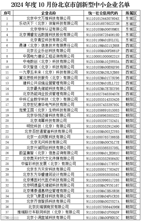 按照工业和信息化部《优质中小企业梯度培育管理暂行办法》(工信部企业〔2022〕63号)、《北京市优质中小企业梯度培育管理实施细则》要求,我局组织各区中小企业主管部门开展了2024年度北京市创新型中小企业的评价、认定工作。前期各区已将认定名单向社会公示、公告,经相关程序,2024年度10月份北京市创新型中小企业名单已经确定,现予以公告。