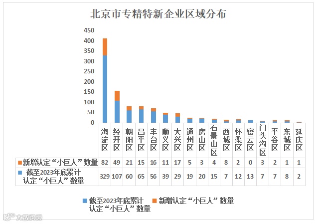 从区域分布看,北京市国家级专精特新“小巨人”企业主要分布在海淀区、经开区和朝阳区,分别有411家、156家和81家,占比(占全部国家级“小巨人”企业)39.71%、15.07%、7.83%。新增国家级专精特新“小巨人”企业240家,主要分布在海淀区(82家)、经济技术开发区(49家)和朝阳区(21家)。从增长率看,西城区、大兴区、延庆区、经开区、门头沟区的增幅均在40%以上。