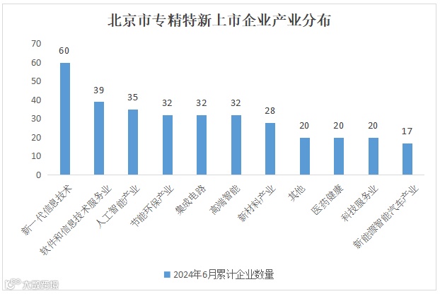 截至2024年6月底,北京上市企业共469家,其中专精特新企业158家,占北京市上市企业的33.69%,占专精特新比例为1.80%。专精特新上市企业主板32家、创业板59家、科创板47家、北交所20家,分别占比20.25%、37.34%、29.75%、12.66%。海淀区上市的专精特新企业最多,达56家,占比35.44%,经济技术开发区21家,朝阳区15家。从产业分布看,上市专精特新企业集中在新一代信息技术产业、软件和信息技术服务业产业、人工智能产业,与上月一致。截至2024年6月底,上市的专精特新企业市值总额达8210.28亿元,企业平均市值为51.96亿元/家。