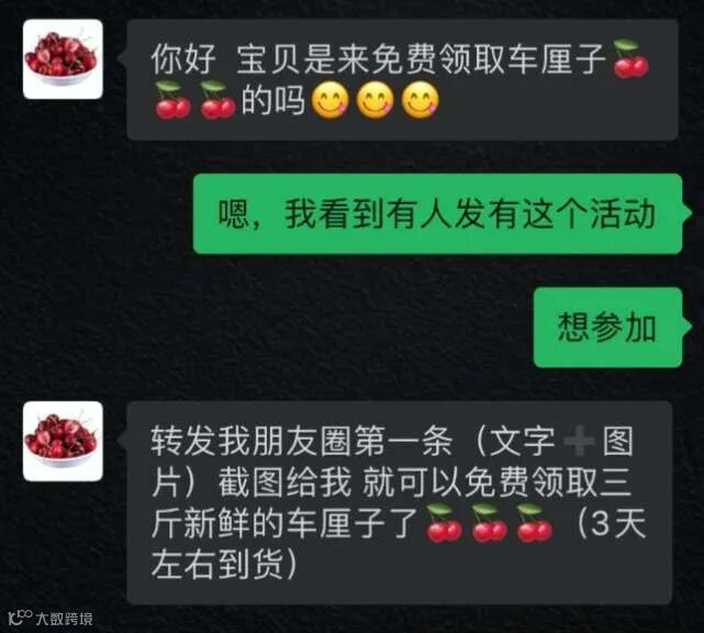 随后,张先生按照要求添加了店家的微信,也按照要求转发了广告图片到朋友圈。“店家很热情,告知转发他朋友圈第一条(文字+图片)到自己朋友圈并截图,即可免费领取三斤新鲜的车厘子,并强调3天左右到货。”