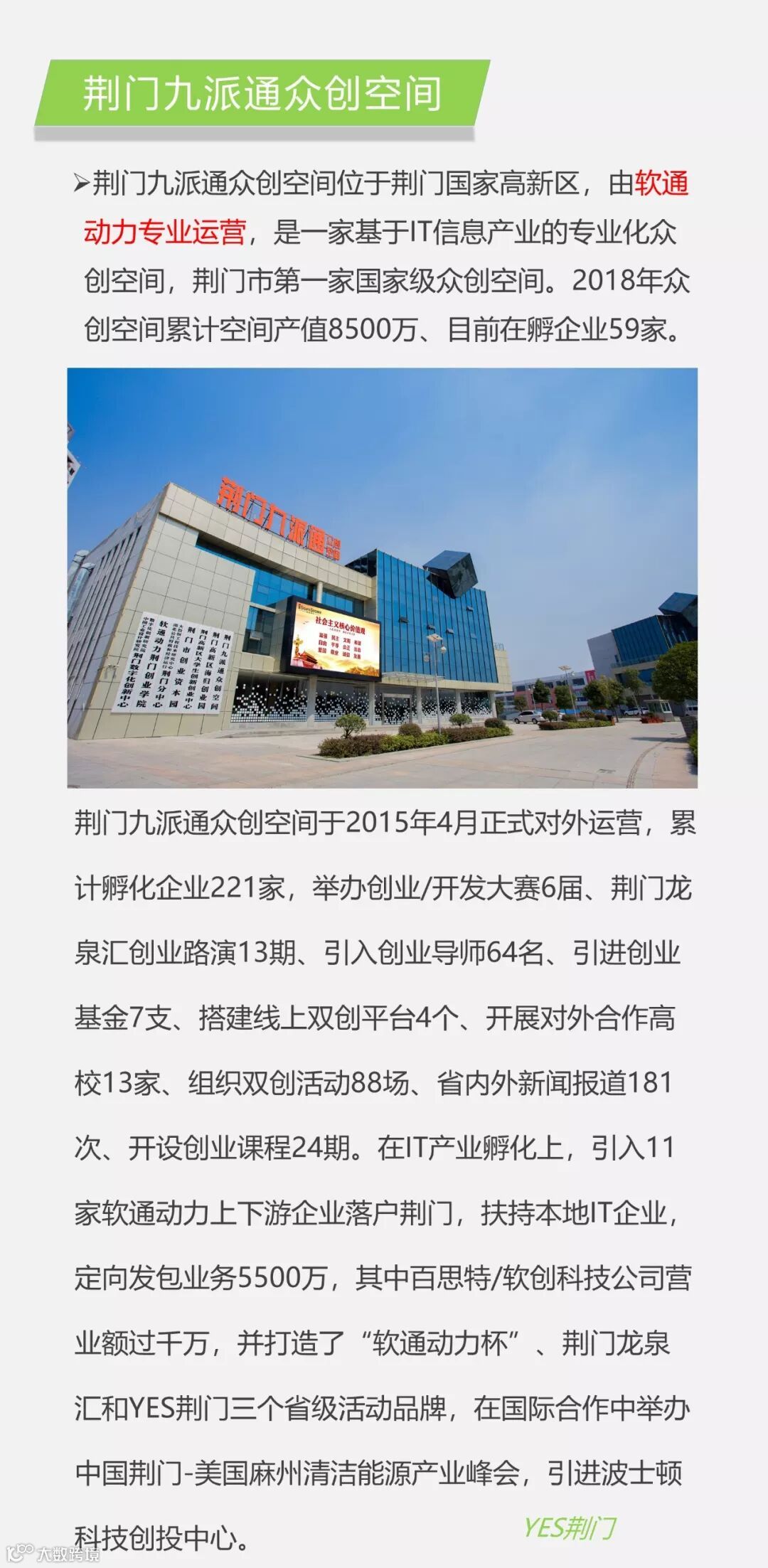 荆门九派通众创空间由荆门高新区管委会和软通动力集团共同打造,打通荆门产业“政-产-学-研-金”完整链条,构建创新创业生态系统,在互联网+、智慧城市领域开展全方位战略合作,共同创立荆门“大众创业、万众创新”的新格局。