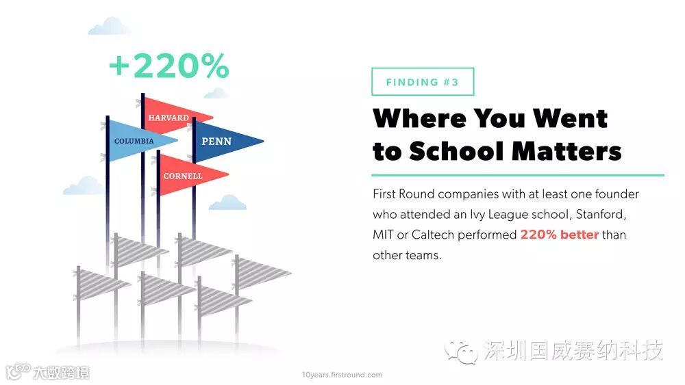 我们同样对这些创始人的学历进行了调查,结果发现创始人毕业院校会对其表现产生一定影响。换句话说,如果团队当中有人是从名校毕业,比如斯坦福、麻省理工或者哈佛,那么整体团队的表现会更好。这样似乎没有说服力,那么根据数据分析,38%的创业团队中都有至少一人毕业于名校,而他们的团队也因此比其它团队优秀220%。