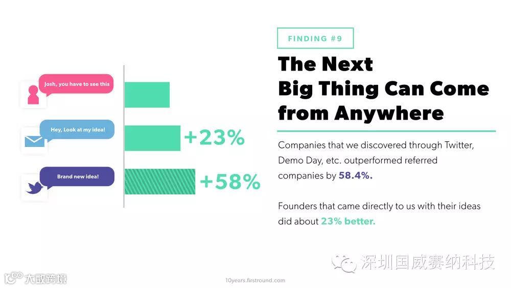 “是金子总会发光的”可能是一句很老套的话,但是我们却得到了最好的验证。尤其是对于那些创业公司来说,他们可以诞生于任何地点,并且表现出色。很长时间以来VC都认为优秀的创业项目都是推荐而来的,但是事实上其它渠道也能够挖到好项目,比如Twitter、DemoDay等渠道。通过这些途径找到的创业项目比推荐的项目优秀58.4%。创始人直接来找FirstRound拿种子轮投资的,工作表现也会高出23%。