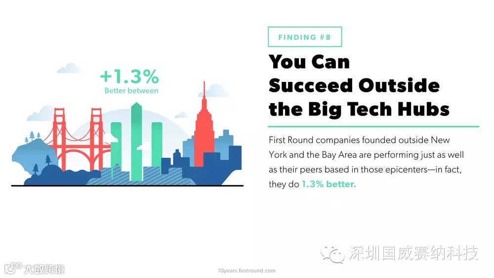 虽然创业聚集地意味着拥有更多的技术和成功的机遇,但是这并不是决定性因素。Firstround投资过的团队中,即使他们并没有在纽约或硅谷(旧金山),他们的成绩也同样优秀。在我们研究的200多家种子轮创业团队,有25%的团队并没有坐落在上述城市,他们的表现与其余75%的团队仅相差1.3%。而且还需要考虑的是那些创业聚集地的团队会拥有更高的估值。