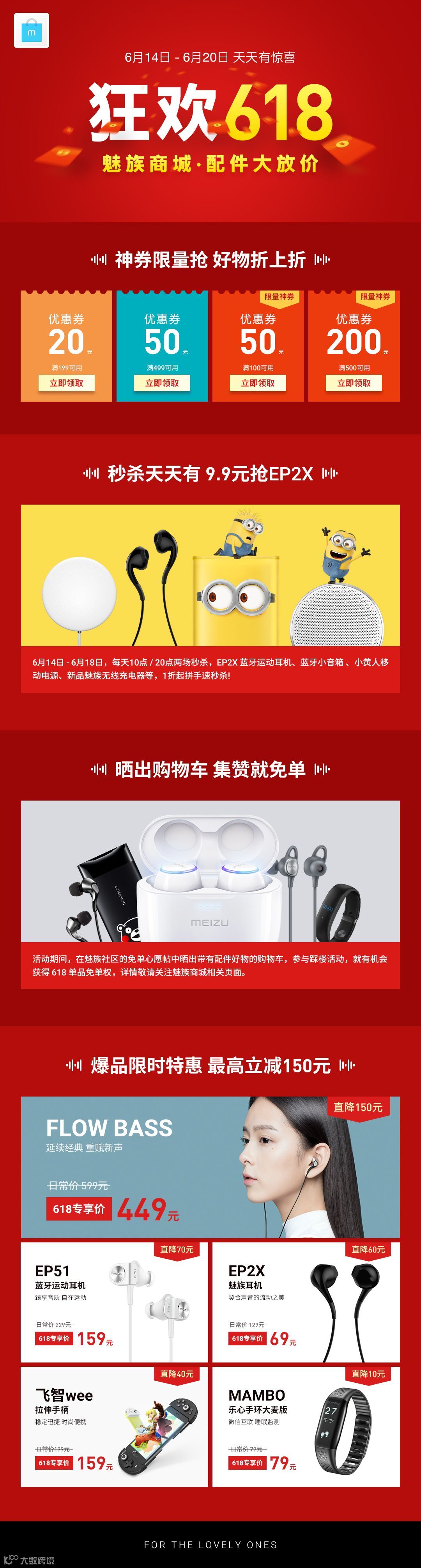 魅族商城6 月 14 日 - 20 日,登录魅族商城,天天有惊喜。神券限量发放,最高可抵 200 元;秒杀天天有,9.9 元抢 EP2X;FLOW BASS 限时特惠,直降 150 元;参与魅族社区踩楼活动,还有机会获得配件单品免单权。更多福利惊喜,尽在 魅族商城 2018 年中盛典。