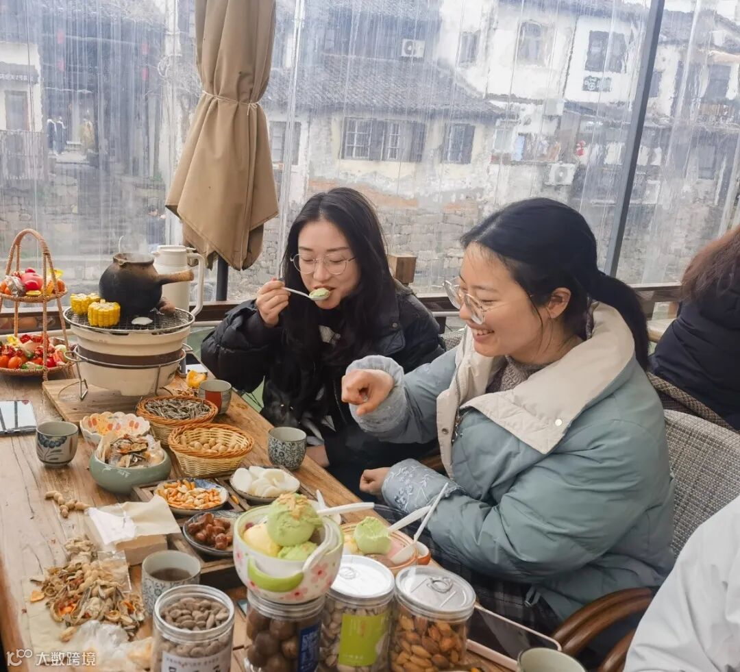 暂别写字楼的喧嚣,在古运河畔的静谧庭院落座。木质长桌、藤编坐垫、青瓷茶盏,搭配春日暖阳与粼粼波光,每一帧都是治愈的风景。围炉炭火轻燃,茶香氤氲升腾,焦香的玉米、软糯的年糕、清甜的柑橘在炉边滋滋作响,舌尖与心灵一同被温柔抚慰。