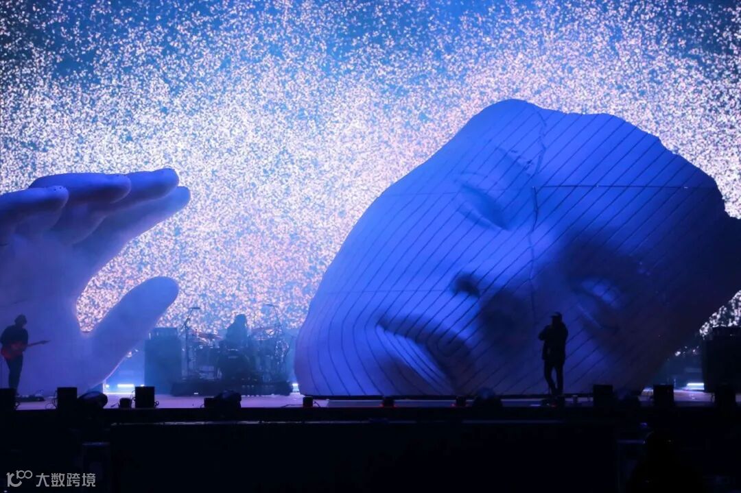 Devlin 对The Weeknd的脸进行3D扫描,为其打造了一个9m高的面部雕塑。巨大的“人像”让舞台呈现出别有的一番视觉效果,随着演出的进行,通过数字投影与灯光,面具的色彩会不断变化,时而像石膏、时而又像金属,燃爆全场。