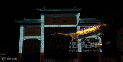 这座尖山牌坊的灯光秀,成像面积约200平,采用户外全息投影应用。
