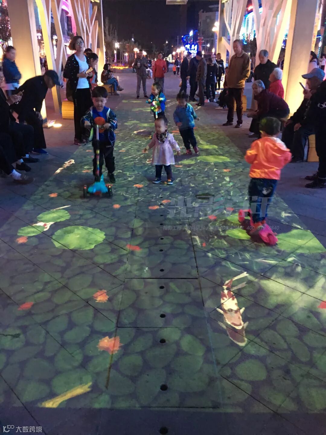 地面互动成像面积:14m*3m ,提供多个主题互动效果,来往行人纷纷停留体验其中,让商业步行街的夜游景象更是活力生机。