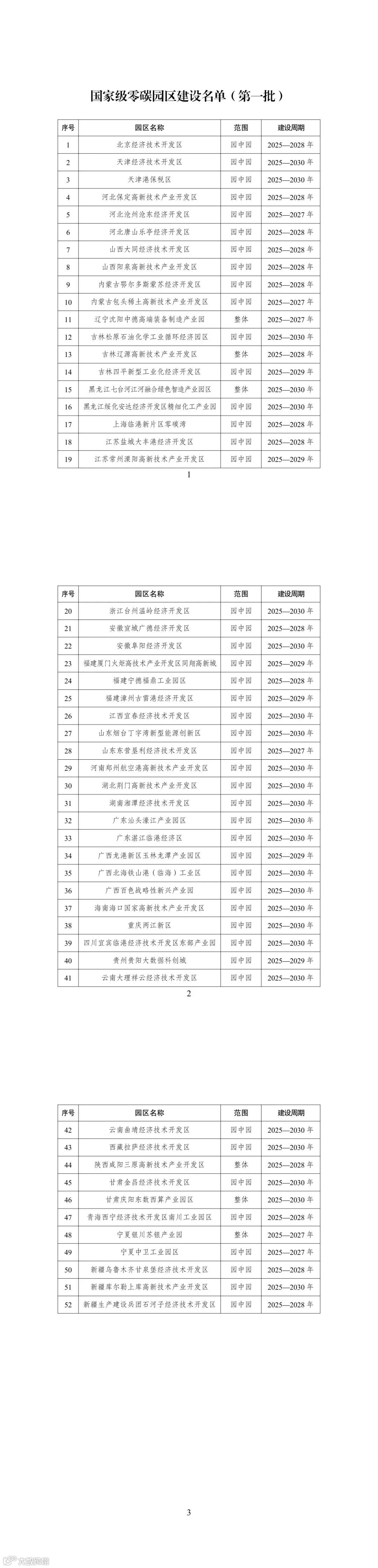 按照《国家发展改革委 工业和信息化部 国家能源局关于开展零碳园区建设的通知》(发改环资〔2025〕910号)要求,经园区申报、地方推荐、专家评审、部门会商等程序,确定了国家级零碳园区建设名单(第一批),共纳入52个园区。现予公布,并就有关事项通知如下: