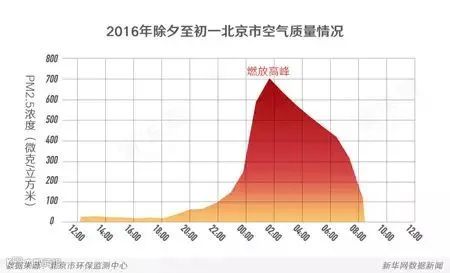 以2016年除夕为例,从当天晚间7时起,受燃放烟花爆竹影响,北京市PM2.5浓度开始呈上升趋势,凌晨0时至1时烟花爆竹集中燃放,全市PM2.5小时浓度达到峰值700微克,由于除夕夜北京市污染扩散条件不利于污染物扩散,PM2.5浓度达到峰值后的回落速度较慢,PM2.5浓度在一段时间内始终维持在较高水平,但大年初一10点之后大气扩散条件转好,污染物浓度迅速降低。