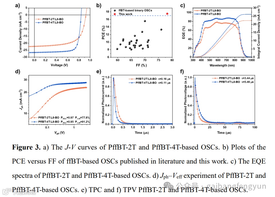 鉴于此,2024年9月12日东华大学胡华伟等人在这篇论文报告了两种二氟苯并噻二唑(ffBT)基共聚物PffBT-2T和PffBT-4T在有机太阳能电池(OSC)中的应用开发。关键发现是,通过在苯并二噻吩(BDT)供体区块和ffBT受体区块之间引入不同的π桥(2个vs 4个噻吩单元),可以调节聚合物的分子间相互作用和聚集倾向。与PffBT-2T相比,PffBT-4T表现出较低的静电势差和与非富勒烯受体L8-BO的较弱相互作用,有利于活性层中相分离和形貌优化。此外,PffBT-4T在薄膜形成过程中表现出延长的核化和晶体生长过程,从而实现了分子堆积的增强。因此,基于PffBT-4T的OSC器件实现了17.5%的创纪录的功率转换效率,优于基于PffBT-2T的器件。