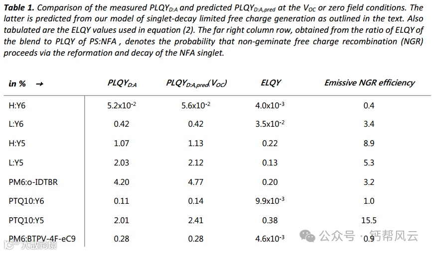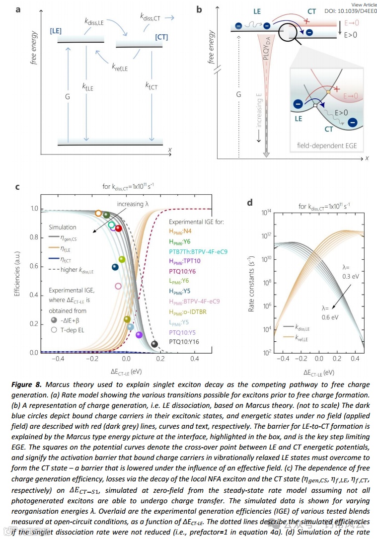 在保持高光电流的同时降低电压损失是当前基于非富勒烯受体(NFA)的有机太阳能电池研究的圣杯。最近的焦点在于理解具有最小能量补偿的有机共混物的多种基本机制-特别是电离能补偿(ΔIE)与自由电荷产生之间的关系。在这里,我们通过将y系列NFA与不同分子量的PM6混合,在多种NFA基共混物中定量探讨了这种关系,覆盖了从15%到1%的宽功率转换效率(PCE)范围。光谱电化学表明,要产生有效的光电流,必须有大于0.3 eV的ΔIE。偏置依赖的延时收集实验表明,对于小的ΔIE共混物,自由电荷产生的场依赖性非常明显,这反映在NFA局部单重态激子(LE)的定量光致发光的强且同时的场依赖性上。我们发现单线态激子的衰变是低偏移NFA基有机太阳能电池中自由电荷产生的主要竞争,没有明显的电荷转移(CT)衰变损失,也没有LE-CT杂化的证据。与这一结论一致,瞬态吸收光谱一致显示,较小的ΔIE减慢了NFA的LE解离成自由电荷,尽管可以通过电场恢复。我们的实验数据与马库斯理论计算一致,并得到密度泛函理论模拟的支持,用于零场自由电荷产生和激子衰变效率。我们得出结论,有效的光电流产生通常要求CT态位于LE以下,但在电荷转移重组能较小的系统中,这一限制被解除。