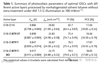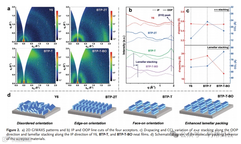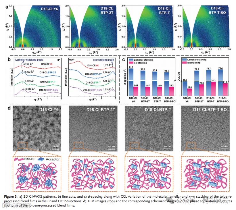 由于供体和受体之间的不匹配聚集行为和有限的相容性,有机太阳能电池(OSCs)的活性层在非卤化溶剂中自发地实现良好的形态是一个挑战。本文通过噻吩取代的烷基链工程,开发了一种强聚集受体的聚集调节策略,以制备高性能的非卤化溶剂处理OSCs,无需添加剂或后处理。用位偶联噻吩取代的烷基链取代烷基链,得到的受体(即BTP-2T、BTP-T和BTP-T- bo)以甲苯作为加工溶剂,显示出与聚合物给体D18-Cl相匹配的还原聚集,使分子排列有序,相分离形态均匀。特别是,对BTP-T-BO的不对称噻吩取代内链和支链外链进行联合修饰,使得D18-Cl:BTP-T-BO共混物形成了优异的纳米级双连续互穿网络,并具有有序紧凑的分子填充。结果表明,以甲苯为处理溶剂,未经任何额外处理的D18-Cl:BTP-T-BO基器件的PCE为18.05%,是未经任何额外处理的非卤化溶剂处理OSCs的最高值。