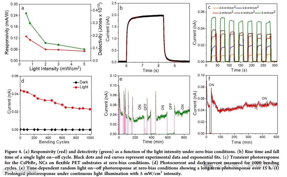 具有自发极化和可见光吸收的铁电全无机卤化物钙钛矿纳米晶体是设计铁电光伏应用的有前途的候选材料。利用全无机卤化物钙钛矿实现可在没有外电场的情况下工作的铁电光伏器件仍然是一个挑战。在这里,我们报道了一种流行的全无机卤化物钙钛矿纳米晶体CsPbBr3,在没有外电场的情况下,在可见光下表现出铁电驱动的光伏效应。原始的CsPbBr3纳米晶体具有铁电键性质,饱和极化为~ 0.15 μC/cm2,居里温度高达462 K,这是由Pb(II)孤对的立体化学活性驱动的。此外,外加电场可以增强光伏效应,并随电场方向改变自发极化。CsPbBr3纳米晶体在没有外电场的连续照明下表现出强大的疲劳性能和长时间的光响应。这些发现确立了全无机卤化物钙钛矿纳米晶体作为设计光铁电器件的潜在候选者,通过耦合光学功能和铁电响应。