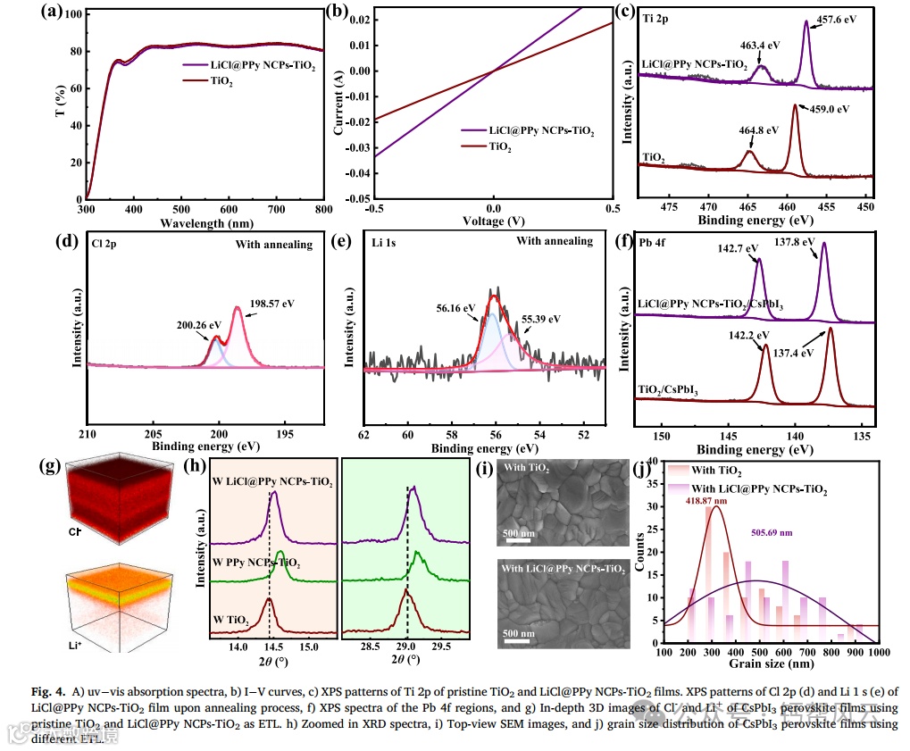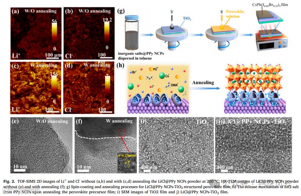 致密的TiO2是制造高效CsPbI3太阳能电池的关键电子传输层(ETL)。用无机离子修饰TiO2是优化能带能级、消除界面缺陷、提高CsPbI3薄膜结晶度的一种简单有效的方法。然而,无机离子有被钙钛矿溶剂(如DMF和DMSO)冲走的风险。在本研究中,制备了核壳无机盐(LiCl, NaCl, ZnCl2)@聚吡咯纳米胶囊(PPy ncp)作为TiO2/CsPbI3层界面的缓冲层。在CsPbI3前驱体膜的退火过程中,这些无机盐从PPy ncp中释放出来,从而防止了它们被DMF/DMSO溶剂冲走。与NaCl@PPy NCPs-TiO2、ZnCl2@PPy NCPs-TiO2和原始TiO2薄膜相比,LiCl@PPy NCPs-TiO2具有最佳的电子导电性和最高的费米能级。释放的LiCl不仅通过形成Li-O-Ti键钝化了TiO2中的点缺陷,优化了TiO2/钙钛矿界面的能级,而且还结合到CsPbI3晶格中,提高了其结晶度。结果表明,基于LiCl@PPy NCPs-TiO2层的太阳能电池的PCE提高了19.78%,开路电压(VOC)和填充因子(FF)分别提高了1.161 V和83.1%。此外,LiCl@PPy NCPs-TiO2层还增强了CsPbI3太阳能电池在湿度条件下的稳定性。