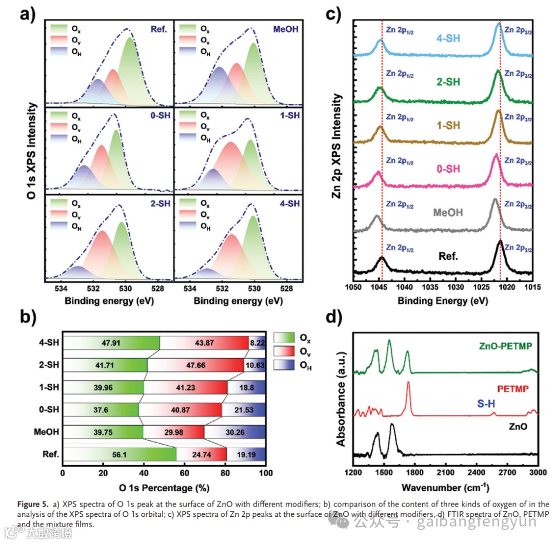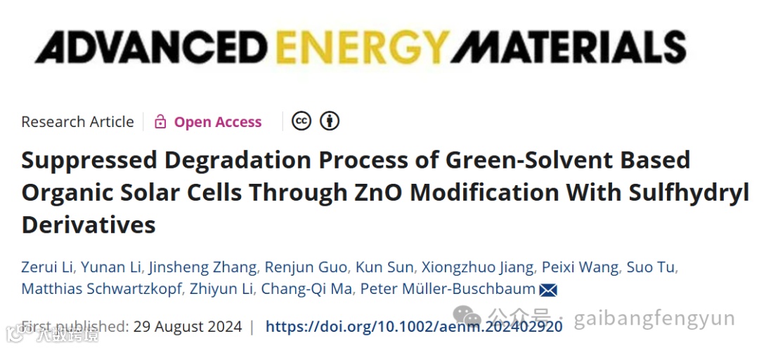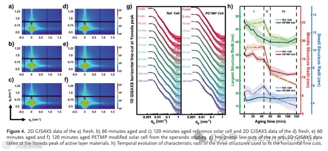 鉴于此,2024年8月30日慕尼黑工业大学Peter Müller-Buschbaum等人这篇研究论文调查了基于绿色溶剂的有机太阳能电池的降解过程,并探讨了使用硫醇衍生物作为ZnO有效稳定修饰剂的应用。该研究采用原位斜入射宽角/小角X射线散射(GIWAXS/GISAXS)技术,深入了解了器件运行过程中的降解过程。发现除了已知的受体在界面处分解外,降解还由分子堆积的压缩和给体结晶度的降低所驱动。五羟甲基丙烷四硫醇酯(PETMP)界面修饰剂被证明可以稳定给体的结晶性,抑制受体的分解,从而提高器件的稳定性。这种修饰效果归因于硫醇基团中的硫和锌之间的相互作用。