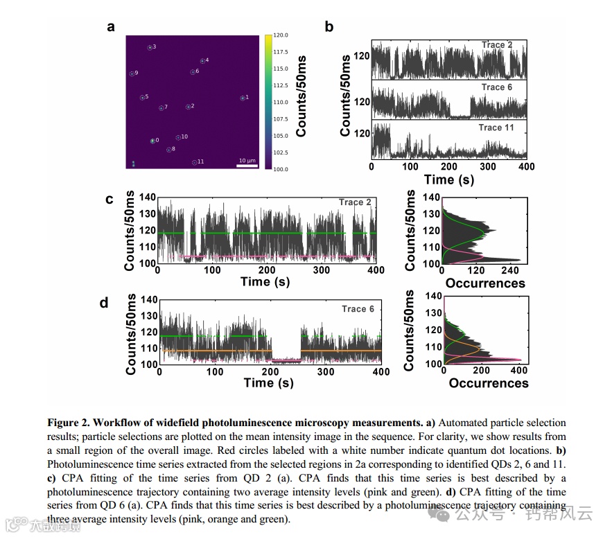 光致发光间歇性仍然是实现钙钛矿量子点(QDs)作为可扩展单光子发射器的最大挑战之一。我们比较了不同配体、卵磷脂、油酸和油胺组合覆盖的CsPbBr3量子点,以阐明表面化学对光致发光间歇性的作用。我们采用宽视场光致发光显微镜,对数百个量子点的闪烁行为进行采样。利用变化点分析,我们实现了闪烁轨迹的鲁棒分类,并分析了大量量子点的代表性分布(磷脂= 1308,油酸/油胺=1317)。我们发现与油酸/油胺相比,卵磷脂抑制CsPbBr3量子点的闪烁。在普通的实验条件下,卵磷脂封顶的量子点不闪烁的可能性要高7.5倍,处于最发射状态的时间要长2.5倍,尽管这两个量子点具有几乎相同的溶液光致发光量子产率。我们测量了光致发光作为稀释的函数,并表明卵磷脂和油酸/油胺覆盖之间的差异在低浓度下出现在单颗粒实验的制备过程中。从实验和第一性原理计算中,我们将卵磷脂和油酸/油胺性能的差异归因于它们的配体结合平衡的差异。与我们的实验数据一致,密度泛函理论计算表明,与油酸/油胺相比,卵磷脂与量子点表面的结合亲和力更强,这意味着稀释过程中配体解吸的可能性降低。这些结果表明,使用更紧密结合的配体是表面钝化的必要条件,因此,用于单粒子和量子光实验的钙钛矿量子点的闪烁还原是必要的。