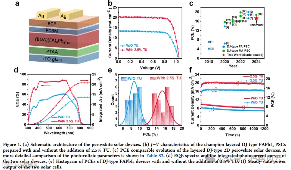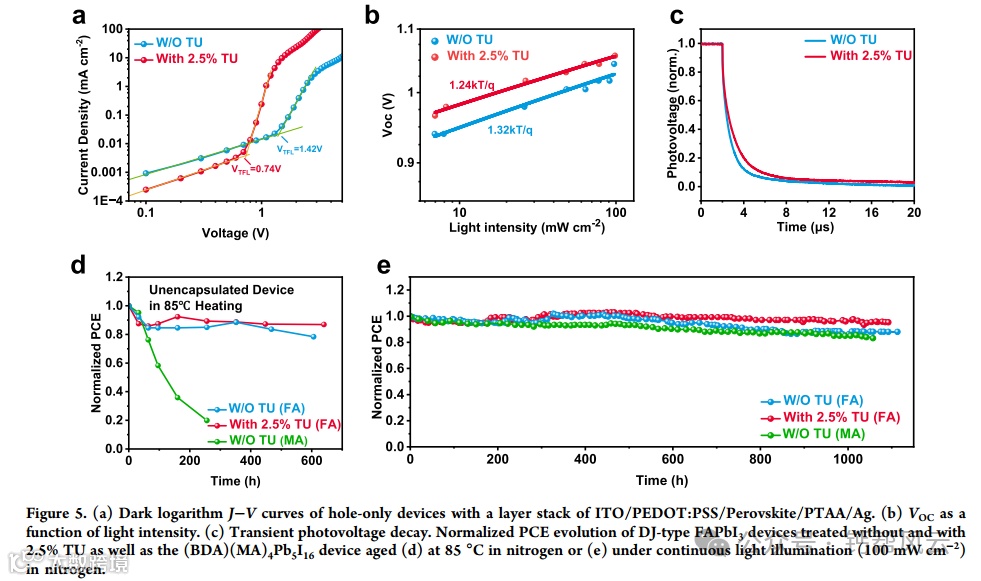 二维(2D)钙钛矿在结构上比三维(3D)类似物更稳定。然而,绝大多数2D钙钛矿太阳能电池(PSCs)含有挥发性甲基铵(MA)阳离子,不幸的是,这损害了它们的效率和稳定性。在这里,我们通过操纵电荷转移,报道了高效和热稳定的单阳离子-甲脒(FA) Dion - Jacobson (DJ) psc。在前驱体中加入少量的硫脲(TU),与对照膜中的梯度相分布相比,可以得到均匀分布的二维钙钛矿膜。因此,在基于tu的器件中实现了显著增强的光谱响应和电荷提取,这主要是由于从小n相到大n相的有效电荷转移。最终,冠军dj型FAPbI3 ((BDA)(FA)4Pb5I16) PSCs具有20.48 mA cm−2的高短路电流密度和17.27%的效率,创造了印刷dj型PSCs (n≤5)的效率记录,并且表现出比DJ-MAPbI3更好的热稳定性和工作稳定性。