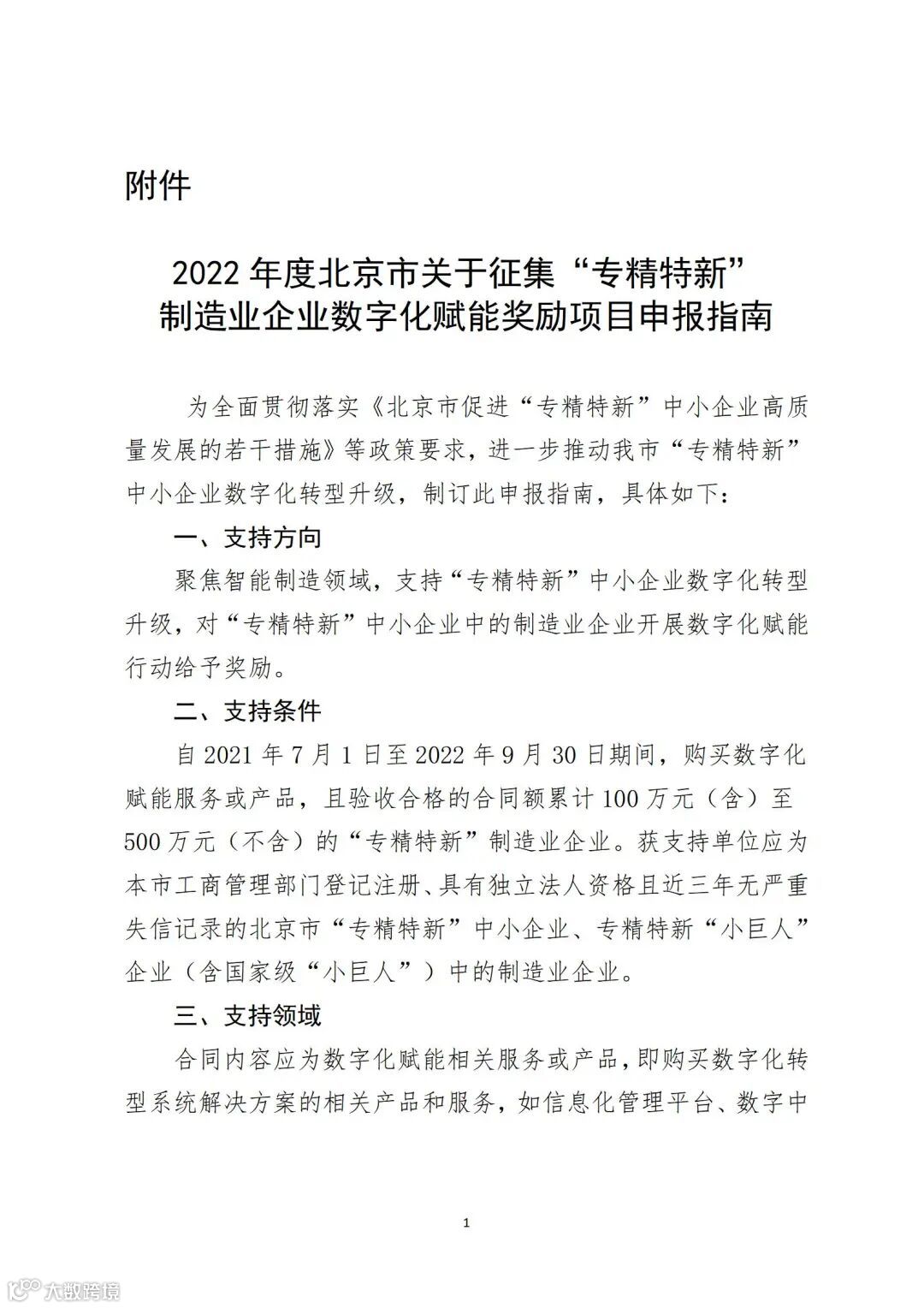 附件:2022年度北京市关于征集“专精特新”制造业企业数字化赋能奖励项目申报指南