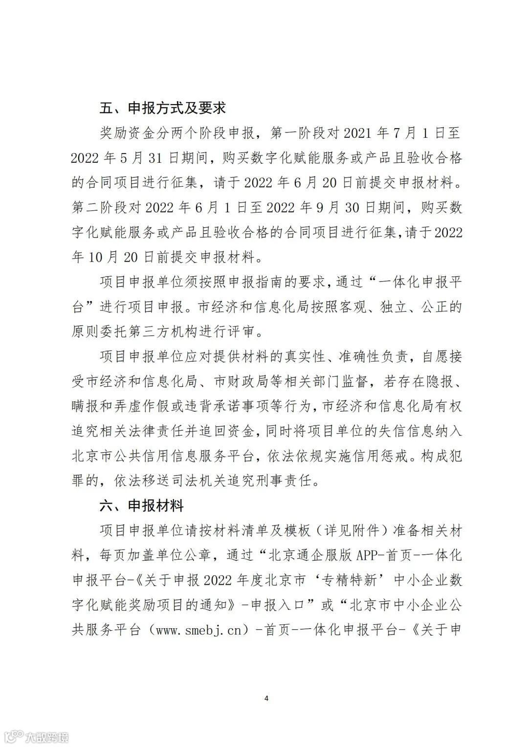 3.项目申报单位应于2022年10月20日前将申报材料提交至zhongxiaochu@jxj.beijing.gov.cn,邮件标题“单位名称+数字化赋能奖励项目”。逾期未提交的不再受理(以邮件发送时间为准)。