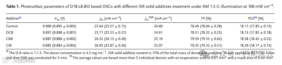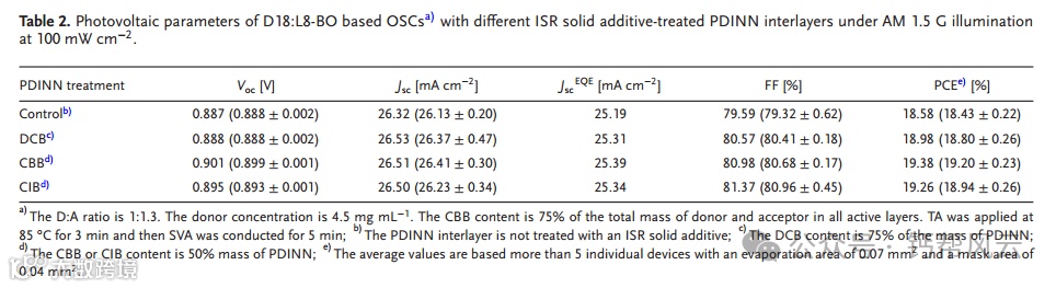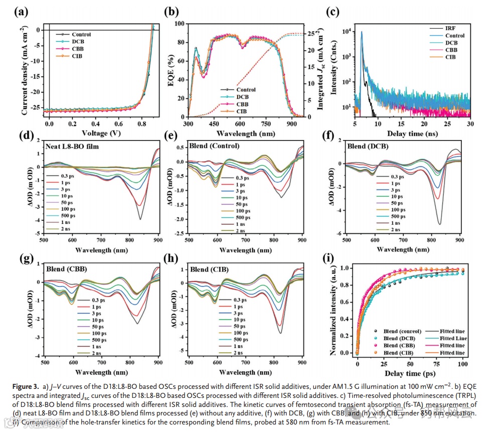 原位可移除(ISR)固体添加剂可以采用冷升华工艺优化有机太阳能电池(OSCs)的活性层形态,从而保持其独特的潜力。本文提出了一种新的ISR固体添加剂1-溴-4-氯苯(CBB),其去除时间(TR)介于已报道的ISR固体添加剂1,4-二氯苯(DCB)和1-氯-4-碘苯(CIB)之间。具有中等TR的CBB具有最有效的激子分裂、最快的激子转移和最平衡的载流子输运,有利于提供最佳的有源层形态和D18:L8-BO二元有源层的最高功率转换效率(PCE)为18.58%。由于其独特的ISR能力,进一步提出了DCB、CBB和CIB来优化PDINN阴极间层的聚集。特别是,CBB和cib处理的PDINN中间层提供了基于D18:L8-BO的二元OSCs, pce分别为19.38%和19.26%,填充系数分别为80.98%和81.37%。经过CBB和cib处理的PDINN中间层可以抑制器件的非辐射复合,从而产生更高的开路电压。这项工作不仅为发展ISR固体添加剂提供了有效途径,而且扩大了ISR固体添加剂在osc中的应用。