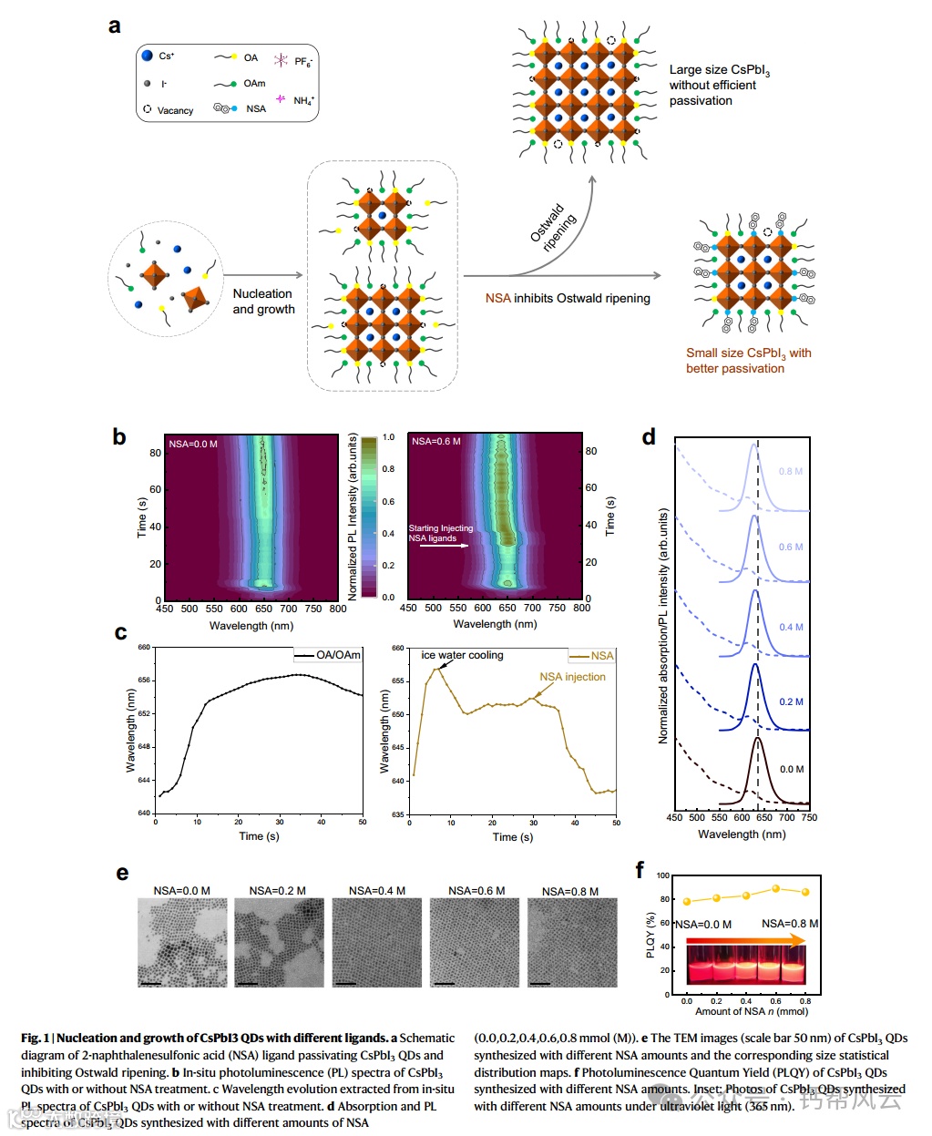 尽管卤化铅钙钛矿已被证明是下一代显示应用的有前途的光电材料,但实现覆盖整个可见波长的高效稳定的纯红色(620~635 nm)发射仍然具有挑战性。在这里,我们报道了钙钛矿发光二极管在628 nm发射纯红光,获得26.04%的高外量子效率。该性能归功于成功合成了具有良好稳定性的强约束CsPbI3量子点。成核后引入强结合的2-萘磺酸配体抑制奥斯特瓦尔德成熟,同时六氟磷酸铵在纯化过程中交换长链配体,避免强结合再生。两种配体均增强了CsPbI3量子点的电荷输运能力。最先进的纯红色CsPbI3量子点合成达到了94%的高量子效率,50天后可保持在80%以上,为合成稳定的强受限钙钛矿量子点提供了一种方法。