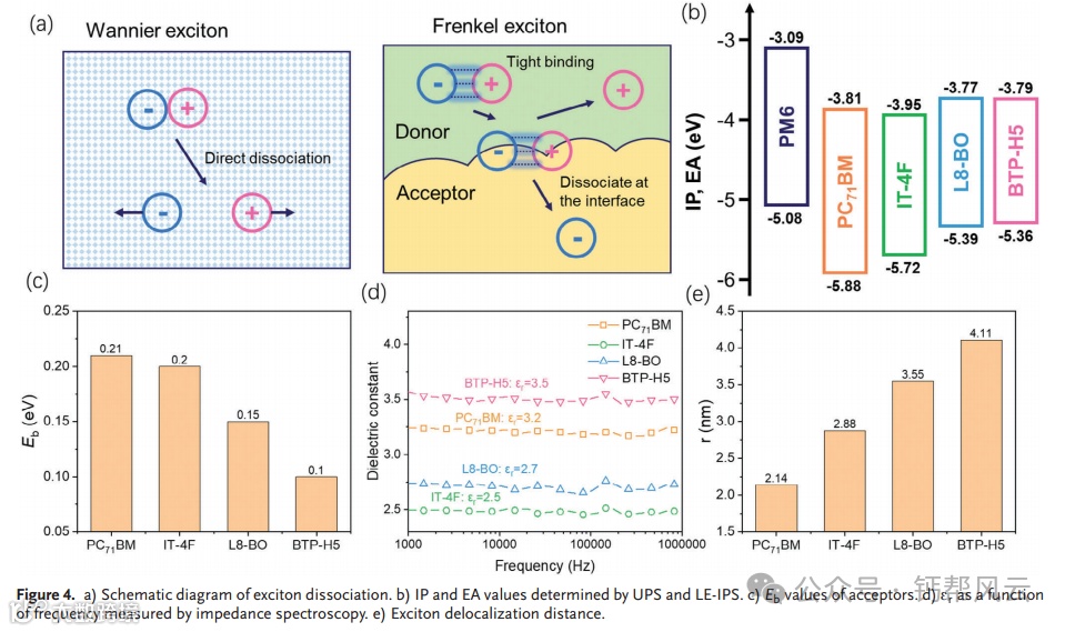 在有机太阳能电池(OSCs)中,电子受体经历了多次更新,从最初的富勒烯衍生物,到后来的受体-供体-受体型非富勒烯受体(NFAs),再到现在的y系列NFAs,其效率已达到19%以上。然而,分子结构设计进一步提高效率的关键特性仍不清楚。本文选取PC71BM、IT-4F和L8-BO作为受体不同发展阶段的代表,对材料性能进行全面扫描。为了比较,设计并合成了BTP-H5的非对称受体和期望的松界激子。结果表明,降低激子固有结合能(Eb)和增强激子离域能力是提高性能的关键。值得注意的是,从PC71BM到BTP-H5的Eb减少了100 meV,相应的,BTP-H5的电子-空穴对距离几乎是PC71BM的两倍。因此,效率从基于PC71BM的OSC的S-Q极限的40%提高到基于BP-h5的OSC的60%,达到19.07%的效率,是二进制OSC的最高值。本工作定量地揭示了激子离域能力对OSCs效率的推动作用,从而为未来的分子设计提供启示。