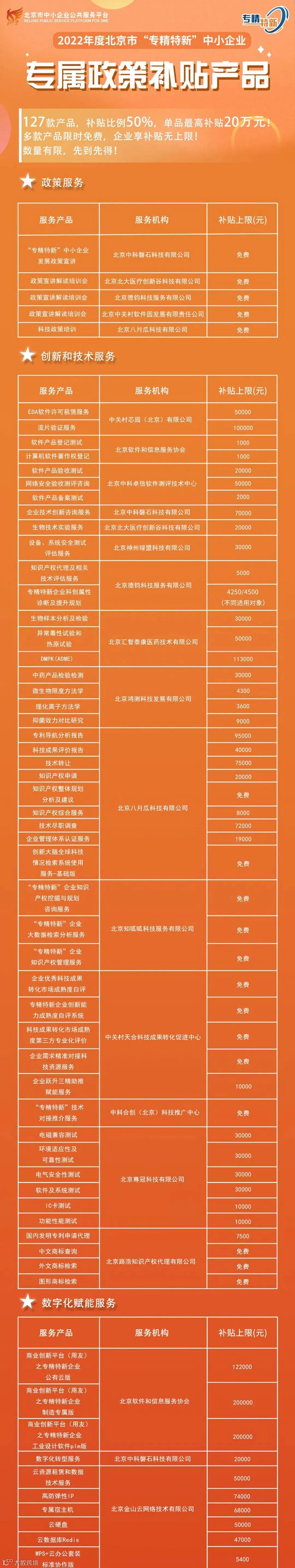 在财政部、工信部、市财政局、市经信局支持下,北京市“专精特新”中小企业专属政策补贴产品,经过扩容后已在“专精特新”专区正式上架!