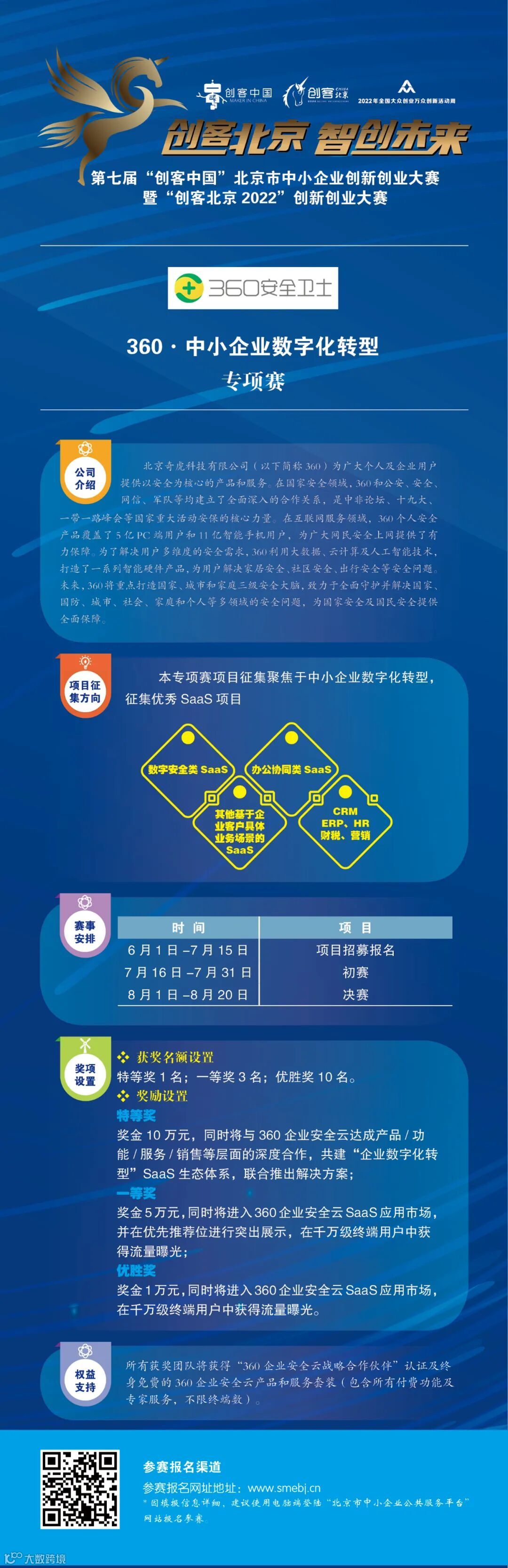 导读:“创客北京”大赛组委会联合奇虎科技举办“创客北京2022”创新创业大赛 360•中小企业数字化转型专项赛。详情点击查看→