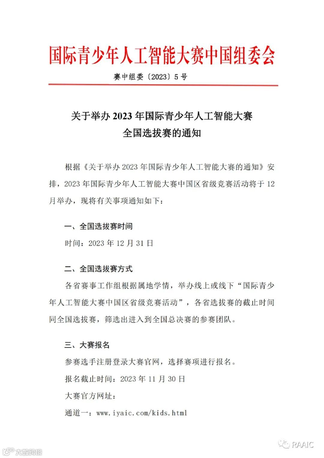 关于举办2023年国际青少年人工智能大赛全国选拔赛的通知