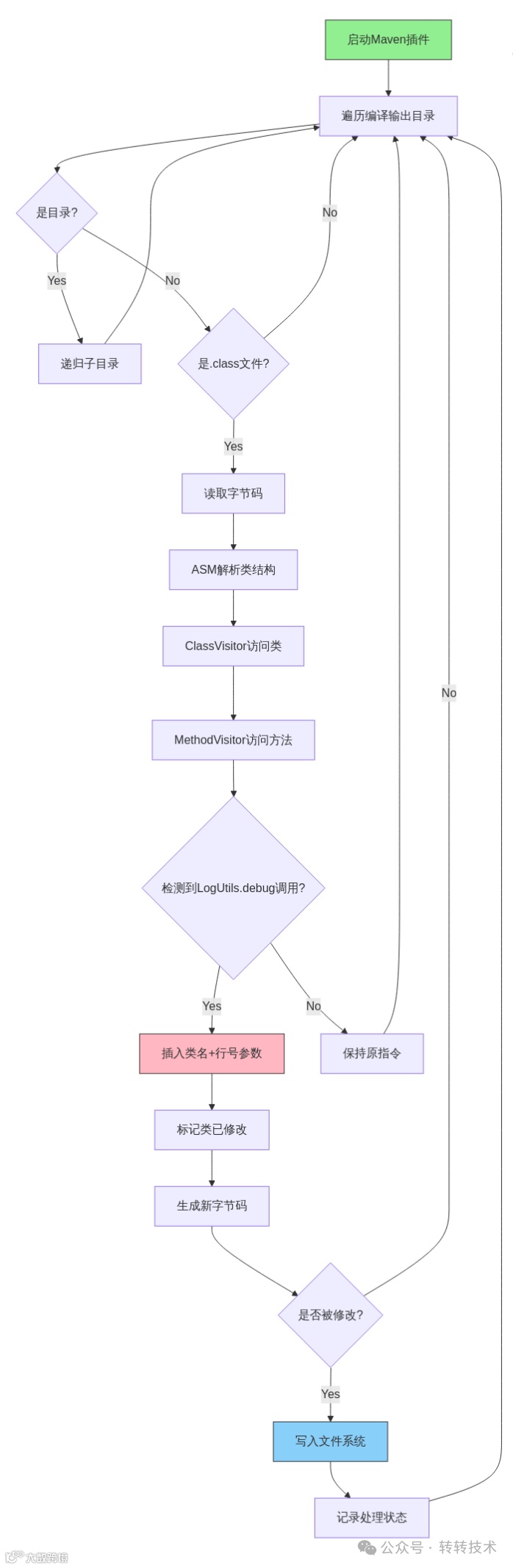 Maven的process-classes阶段获取:通过Maven编译之后获取到字节码文件时,对字节码文件进行修改,存放日志的类和行信息。对运行期间无额外消耗。处理逻辑如下图所示: