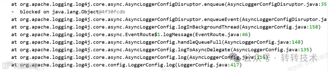 队列满时的默认行为:AsyncLoggerConfig.SynchronizeEnqueueWhenQueueFull=true,此时会等待着消费出下一个可以生产的环形 buffer 槽;此时所有打印日志的线程会尝试获取全局锁。此时会阻塞线程,也就是我们上述堆栈中看到的异常。