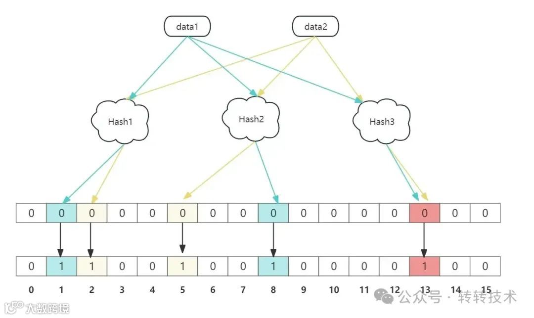 查询data3先根据添加时的三个hash函数计算分别对应值,值分别是2、8、13,然后查询数组中这三个位置的值是否为1。