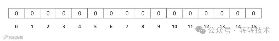布隆过滤器实现原理就是一个超大位数的数组和多个不同Hash算法函数。假设位数组的长度为 m,哈希函数的个数为 k。如下图,一个长度16位的数组,3个不同Hash算法函数,数组里面存储的是 bit 位,只放 0 和 1,初始为 0。