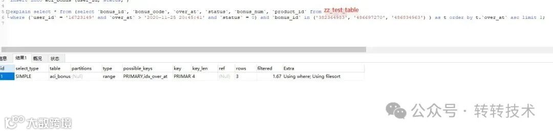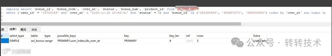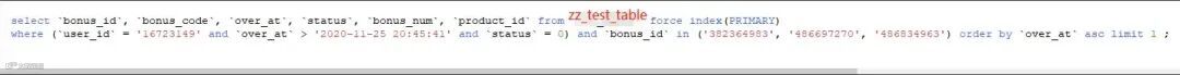 该sql就涉及一张表zz_test_table(真实表名已被隐藏),表里面有两个索引,一个是over_at字段对应的idx_over_at索引,另一个就是bonus_id字段对应的主键索引。