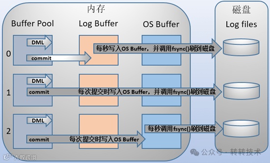 Redo Log Buffer刷盘策略主分为三种,由核心参数innodb_flush_log_at_trx_commit来控制。具体的流程如同下图: