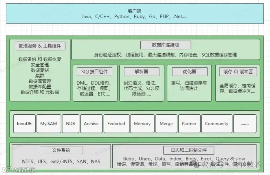 文件系统层:这一层主要包括日志文件、数据文件及与 MySQL 相关的其他程序。在这四个层次中,服务层和存储引擎层构成了架构的核心。服务层负责处理 MySQL 的核心逻辑,而存储引擎层则直接负责数据的存取操作。