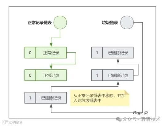 在深入分析问题原因之前先对 DELETE 操作的基本流程进行复习。众所周知,MySQL 以页作为数据的基本存储单位,每个页内包含两个主要的链表:正常记录链表和垃圾链表。每条记录都有一个记录头,记录头中包括一个关键属性——deleted_flag。