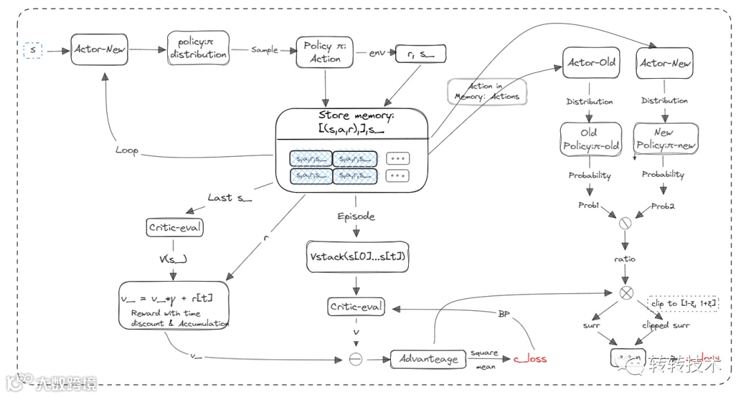 6、计算a_loss = mean(min((ratio* At, clip(ratio, 1-ξ, 1+ξ)* At))),然后反向传播,更新Actor-New网络。