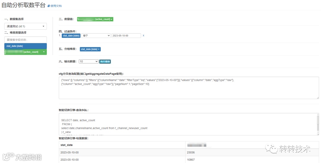 在系统核心功能完成之后,在易用性上我们基于该服务建设了管理功能与自助分析平台。整体如上图所示,我们可以查看自己有权限的数据集,并对数据集的数据进行自助分析,选择维度过滤,确定查询的指标与分组的维度进行自助的数据查询与分析。同时展示了对应的查询参数cfg参数与最终生成的查询SQL,方面前后端开发人员快速上手使用该查询服务,提升开发效率。