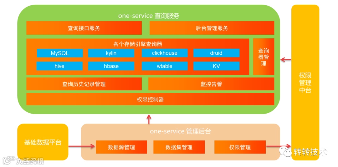 针对之前阐述的系统背景要求与目标,我们设计了一套统一查询服务One-Service,打通了基础数据平台中的元信息,通过配置管理数据源、数据集的方式来应对不同的多样性数据需求。并且接入了权限管理平台,支持对数据集进行权限管理与配置。在服务本身设计了一些服模块功能模块,权限控制模块、查询历史记录、监控告警模块等功能来辅助完成相应的系统要求。