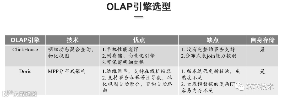 Doris运维简单,扩缩容容易且支持事务,但Doris版本更新迭代较快且成熟度不够,也没有像ClickHouse自带的一些函数如漏斗、留存,不足以支撑转转的业务场景。
